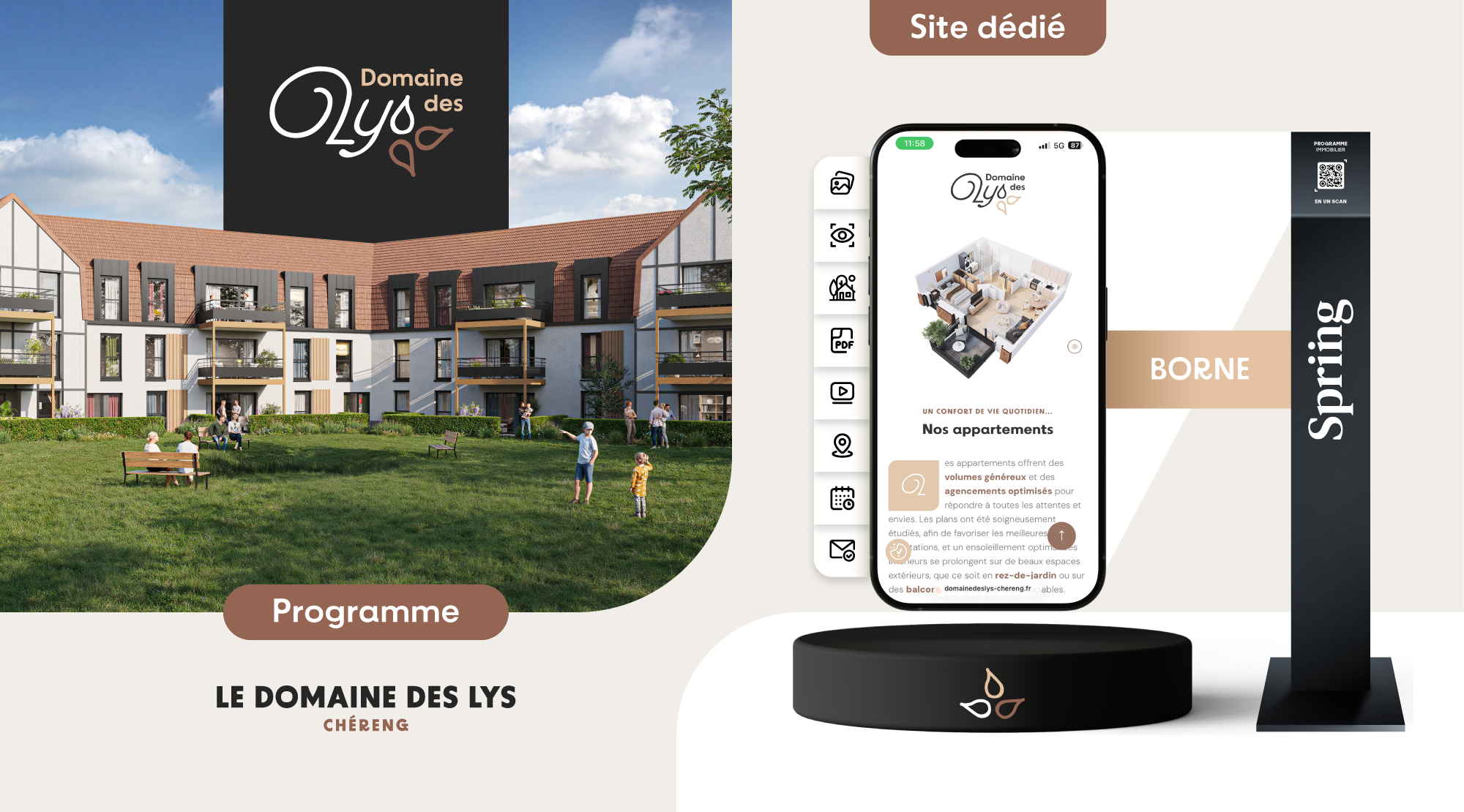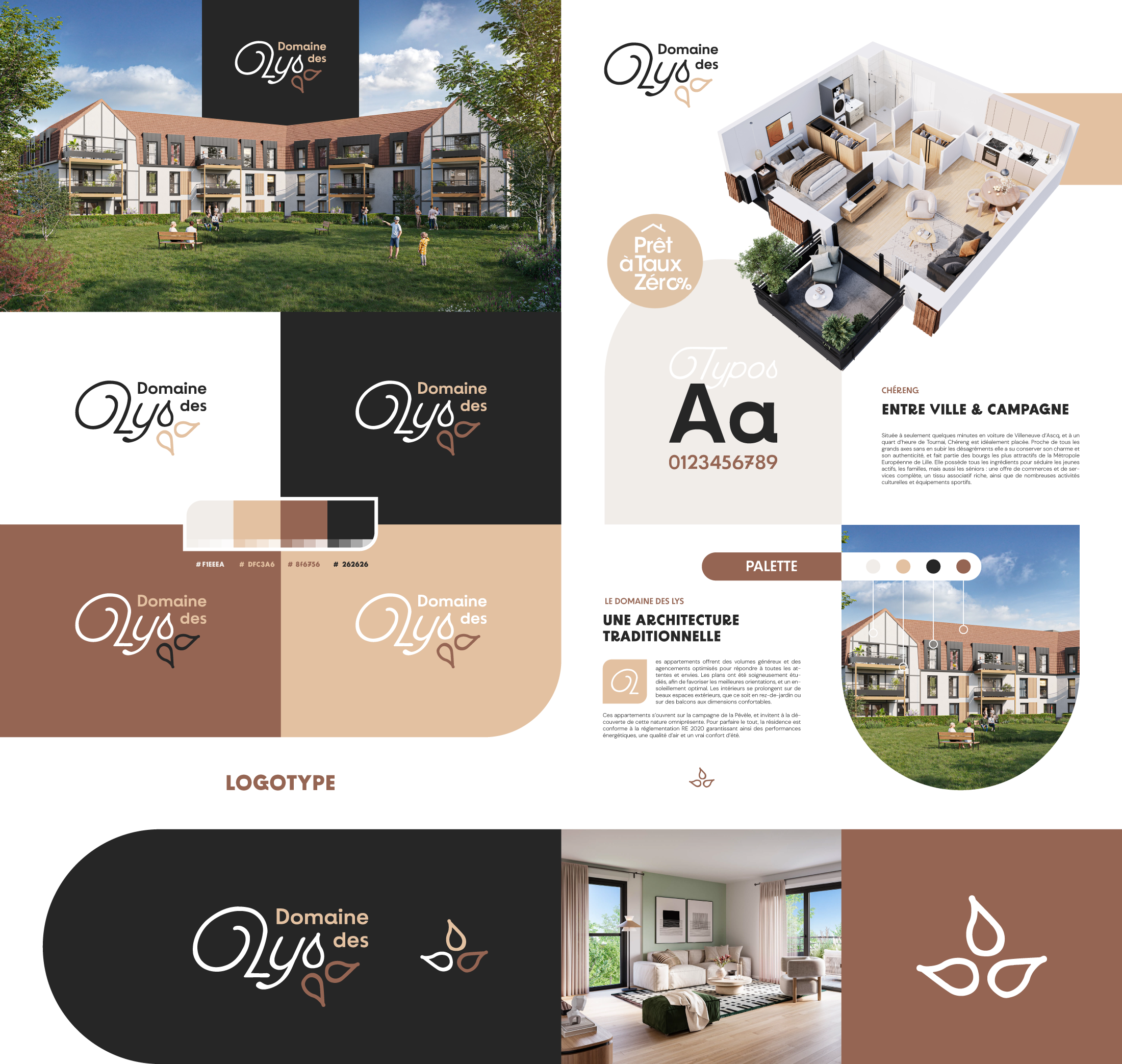 Sa palette chromatique fait directement écho aux matériaux du bâtiment : gris anthracite des balcons, marron de la toiture, beige taupe des boiseries et tons clairs des façades. Cette cohérence visuelle ancre l’identité dans l’architecture du projet tout en affirmant un positionnement premium et qualitatif.