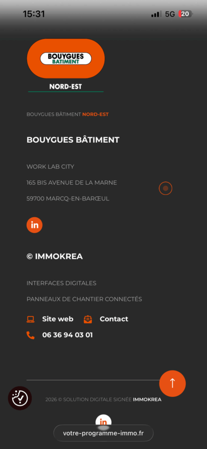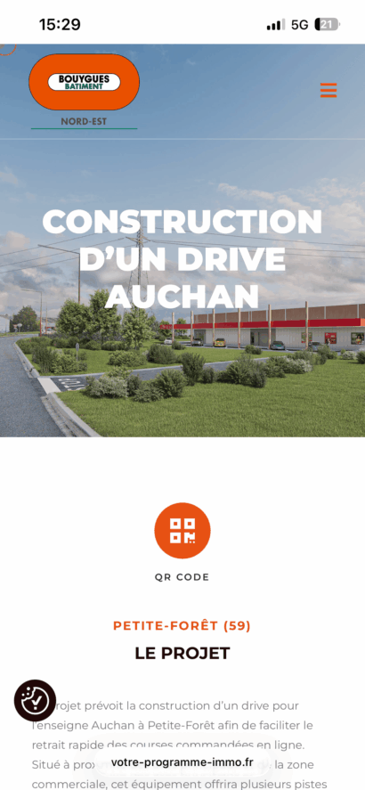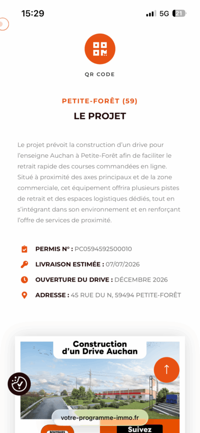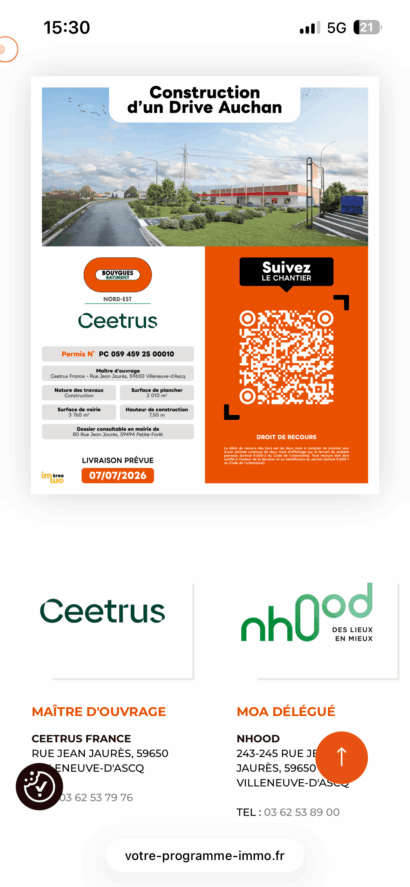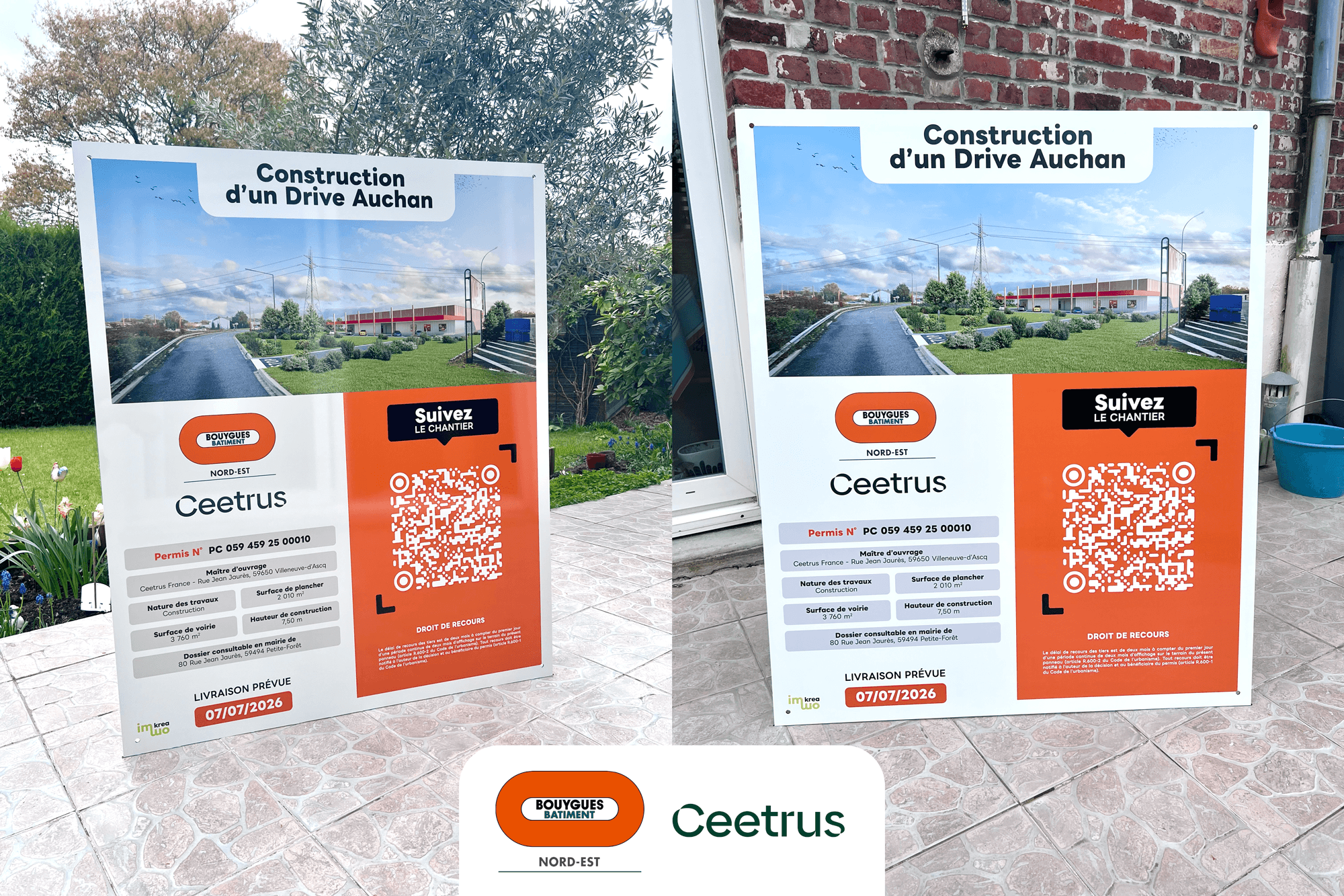 Déploiement d’un panneau de chantier connecté pour Bouygues Bâtiment Nord-Est dans le cadre de la construction d’un drive Auchan à Petite-Forêt. Cette solution digitale ergonomique renforce l’information et la transparence auprès des riverains, partenaires et usagers, grâce à un accès simplifié via QR code 📲 et à la diffusion de données chantier actualisées en temps réel.