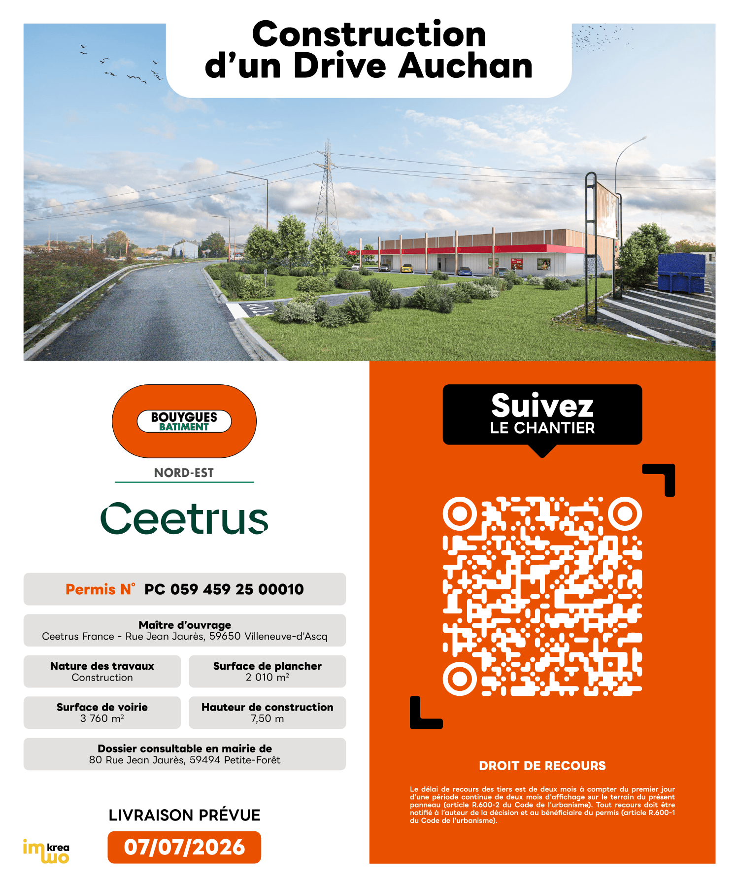 ClientBouygues Bâtiment Nord-EstTravauxConstruction d'un Drive AuchanLieuPetite-ForêtPermis n°PC 059 459 25 00010Date31 Mars 2026Share