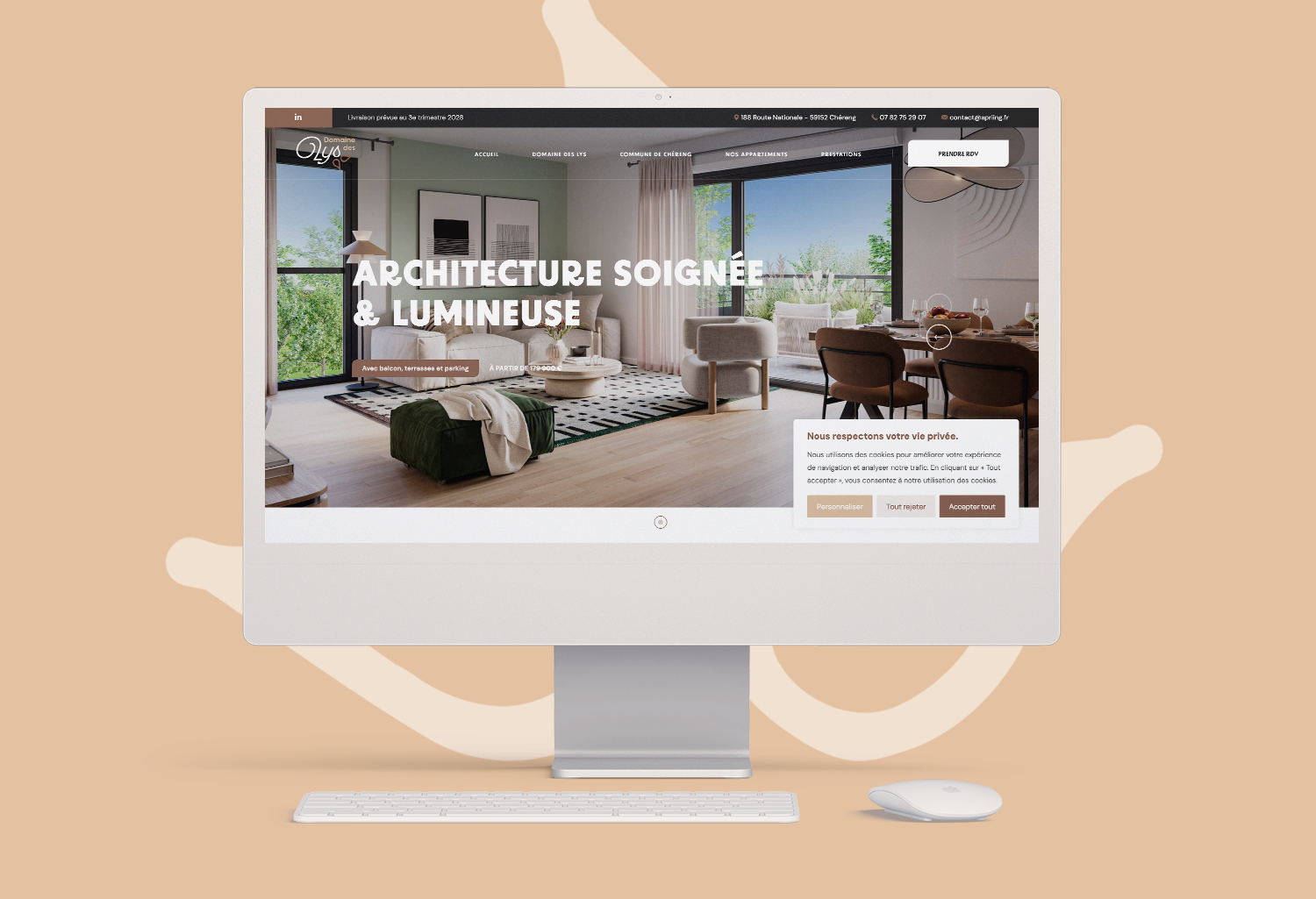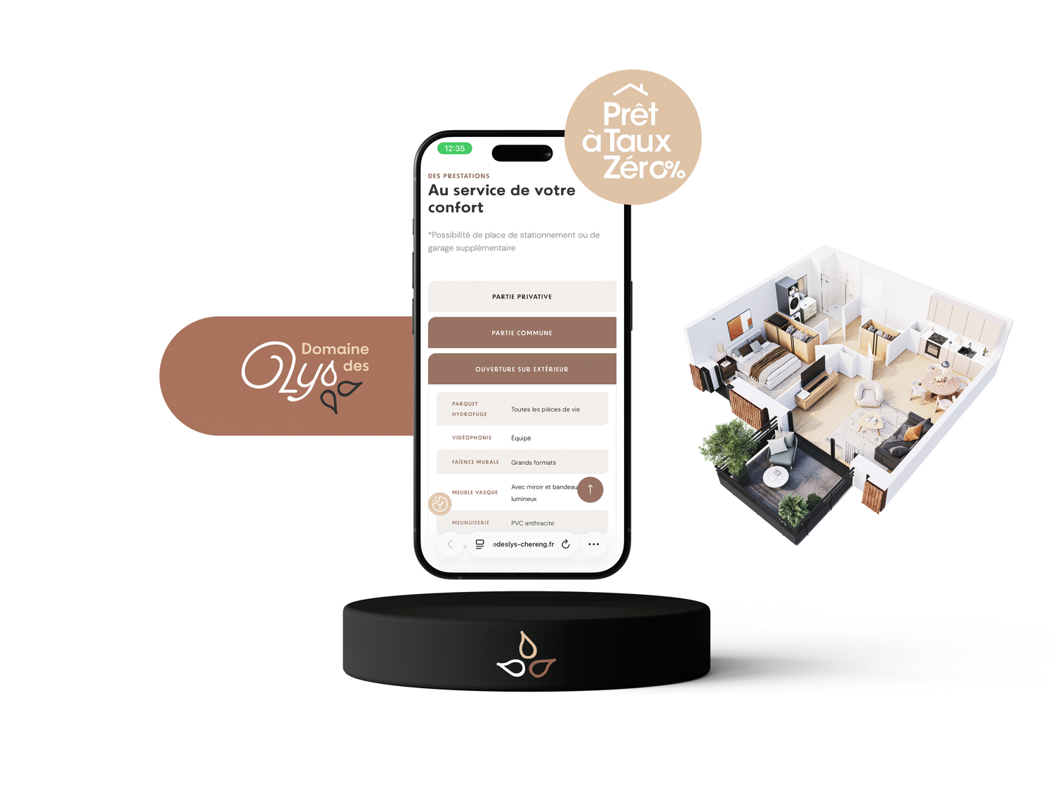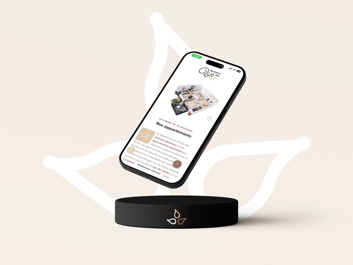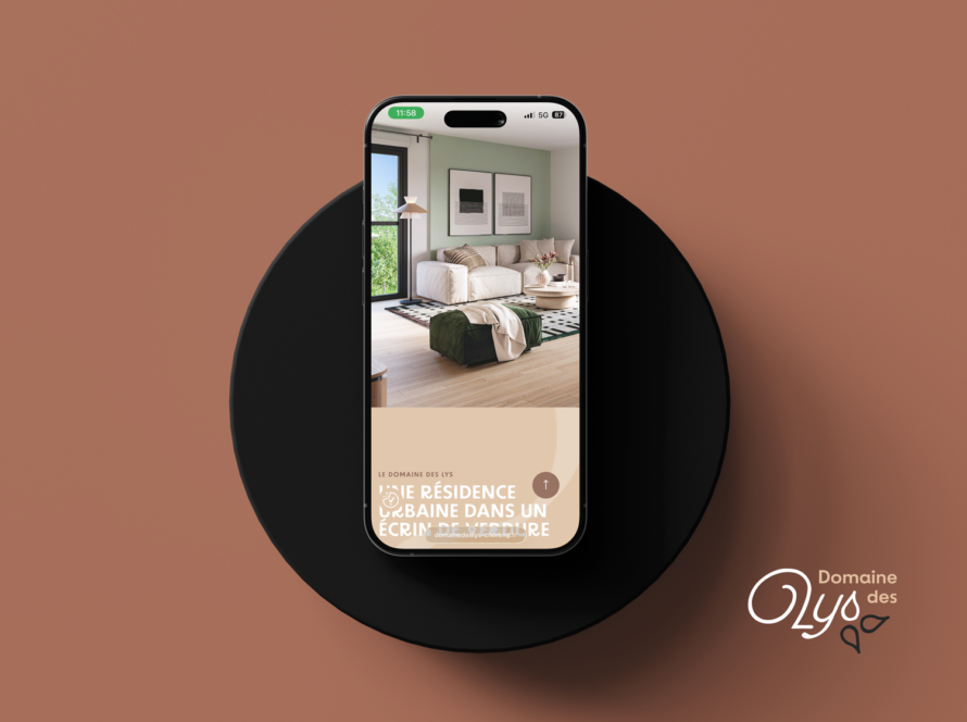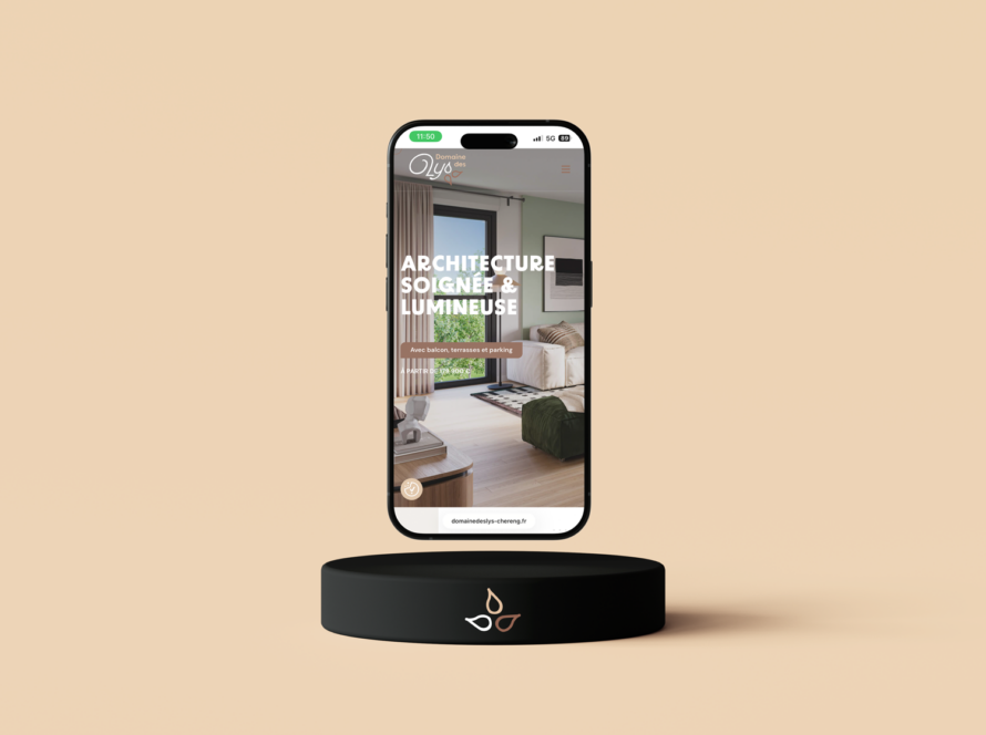 Sa palette chromatique fait directement écho aux matériaux du bâtiment : gris anthracite des balcons, marron de la toiture, beige taupe des boiseries et tons clairs des façades. Cette cohérence visuelle ancre l’identité dans l’architecture du projet tout en affirmant un positionnement premium et qualitatif.